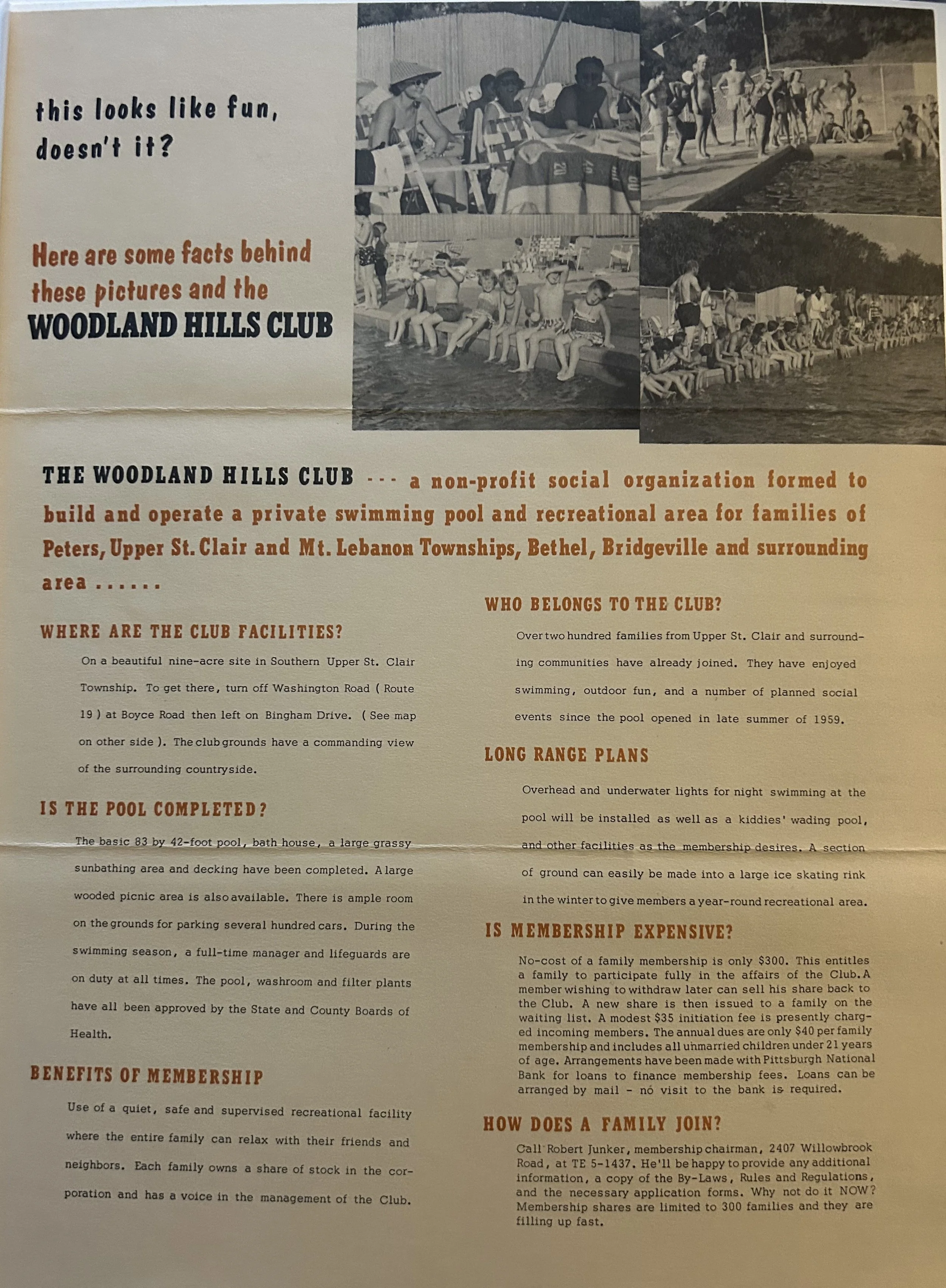 A comparatively rural school district at the time, Upper St. Clair wouldn’t even graduate its first class until two years after the printing of that trifold brochure above - and those first alumni had actually spent all twelve grades at what is now Ft. Couch Middle School, since construction of Upper St. Clair High School wouldn’t be completed for two more years. Before 1957, USCSD’s small population of 10th- through 12th-grade students had commuted to Mt. Lebanon High School, where they were (mostly) affectionately referred to as kids from The Farm. Regardless, when they all gathered at Woodland Hills, they were each part of the same “congenial” Club community.