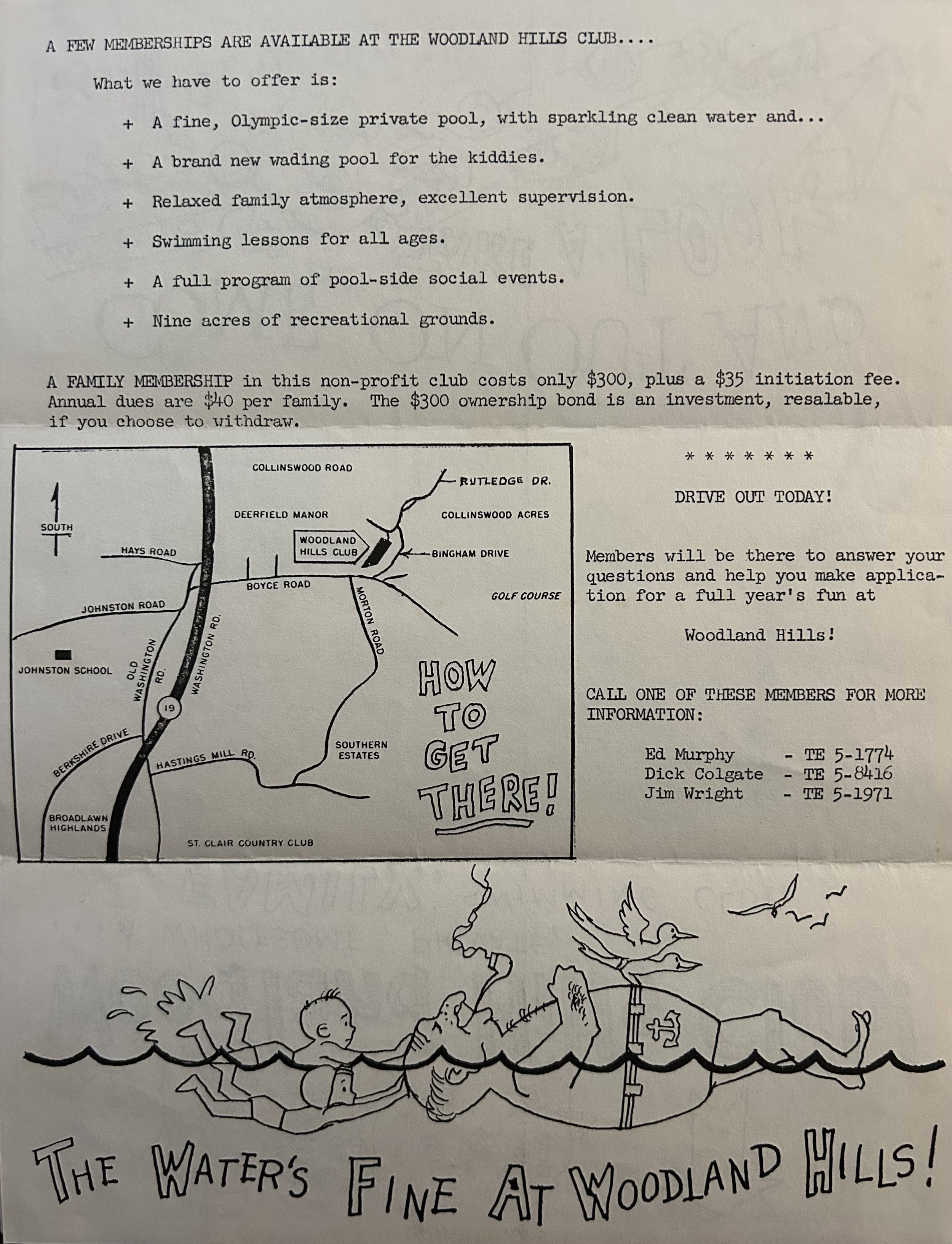 Soon after purchasing our first seven acres and successfully petitioning Upper St. Clair for re-zoning so that a pool could be built on Woodland Hills Club’s property, our Board of Governors (as our volunteer leaders were then known) added another 1.7 acres to our grounds - all at a purchase price of $1,875 per acre. Fortunately for us, they had the foresight to acquire more land than was really necessary for a swim club. They envisioned a wading pool, a gatehouse with showers, a wooded picnic area, and facilities for tennis, volleyball, shuffleboard and, according to the ad above, even ice skating!