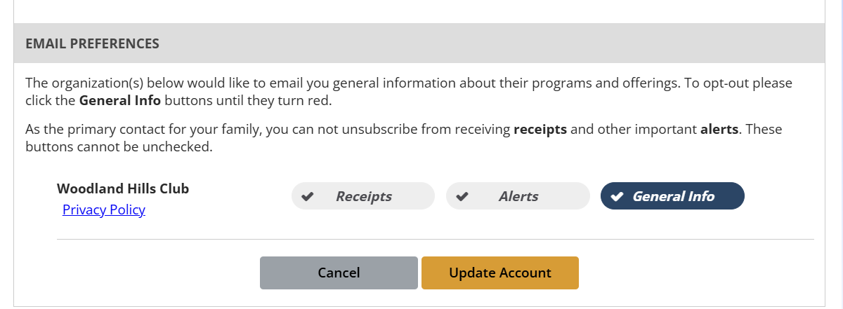 4. Scroll to the bottom of this page too, and look at the three buttons. If the button labeled “General Info” doesn’t have a checkmark, then you won’t receive any Club email messages that aren’t receipts or special alerts.